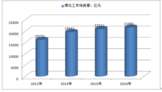 2013年我国煤化工行业产成品市场规模为16251亿元,到2016年底,煤化工行业产成品市场规模突破了21682亿元。